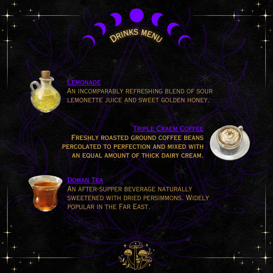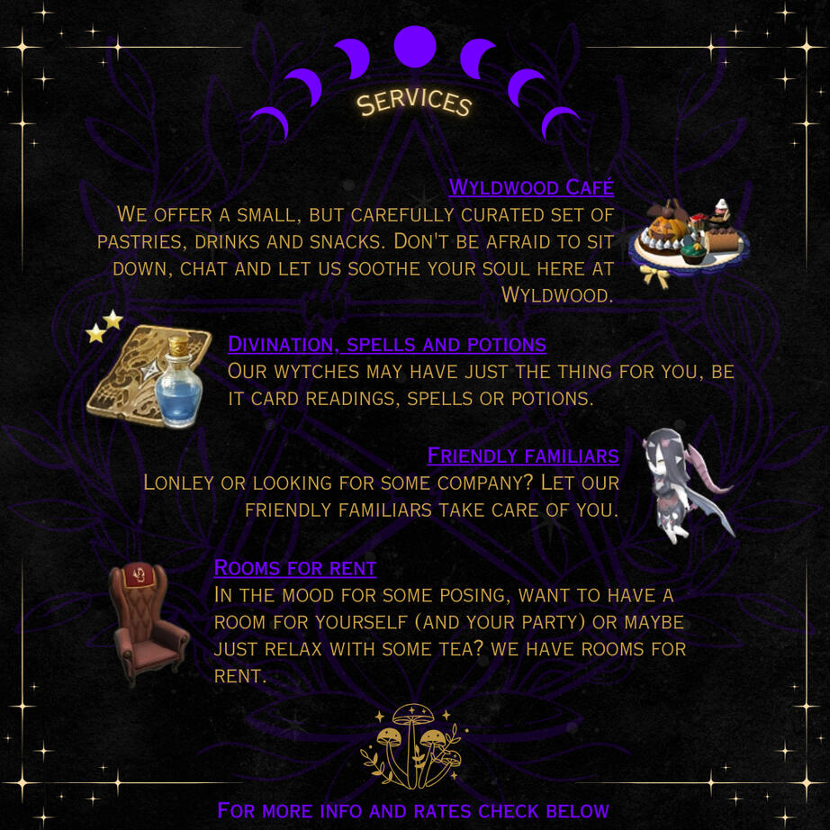 We offer a small but carefully curated and handpicked selection of pastry and drinks. We also offer a variety of services for your needs. Feel free to drop by when we are open to see what we have to offer on the specific day. Menu and services may vary from opening to opening.Roleplay highly encouraged, but not mandatory. We are both immersive, beginner and out of character friendly here at Wyldwood.