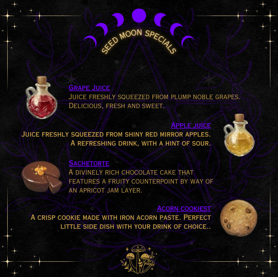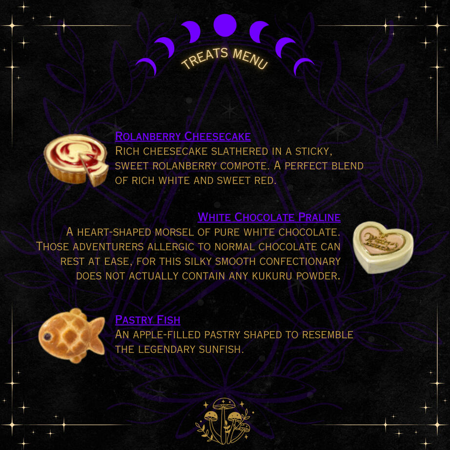 We offer a small but carefully curated and handpicked selection of pastry and drinks. We also offer a variety of services for your needs. Feel free to drop by when we are open to see what we have to offer on the specific day. Menu and services may vary from opening to opening.Roleplay highly encouraged, but not mandatory. We are both immersive, beginner and out of character friendly here at Wyldwood.